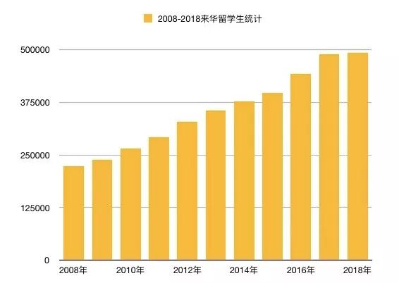 过去11年,来华留学生逐年增长,从2008年的223499人,增加到2018年的492185人,十一年增长率达到了120%。数据来源:中国教育部、中国高等教育学会外国留学生教育管理分会。本图统计数据不包括港、澳、台地区。