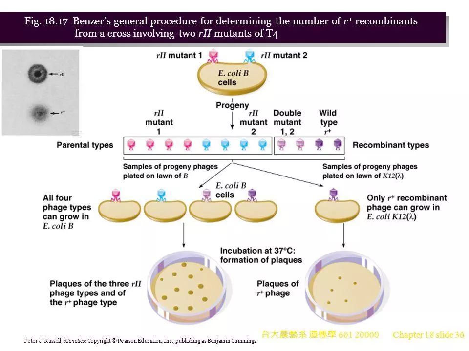 ?本泽揭示rII基因内部精细结构的实验示意图。两株不同的rII突变体杂交后会产生完好的rII基因,证明了基因确实存在精细结构。这里所用的B品系大肠杆菌最早是由德尔布吕克和鲁里亚发现并引进到噬菌体实验中的。 图片来源:Pearson Education. iGenetics by Peter Russel