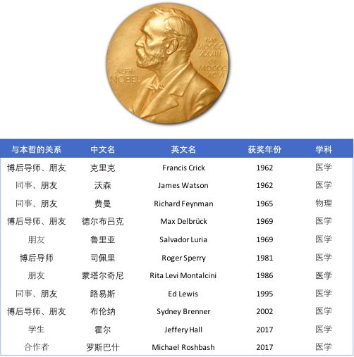 ?本文提到的部分本泽的导师与朋友获得诺贝尔奖的情况,“遍插茱萸少一人”。 图片来源:作者整理