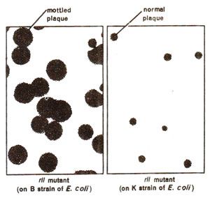 ?左图:rII突变的噬菌体在感染B品系大肠杆菌后会产生比正常更大的噬菌斑。右图:rII突变的噬菌体无法侵染K品系大肠杆菌。两图中少量的小噬菌斑均是由混在样品中的野生型噬菌体造成。 图片来源:Biocyclopedia.com