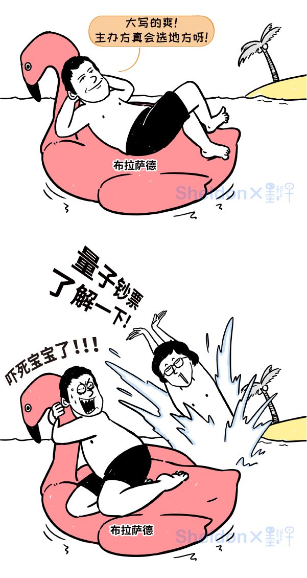 有一天,一位叫布拉萨德的博士生( Gilles Brassard )正在海里游泳,忽然,他发现有一个人迎面向他游过来,越来越近,越来越近,然后……