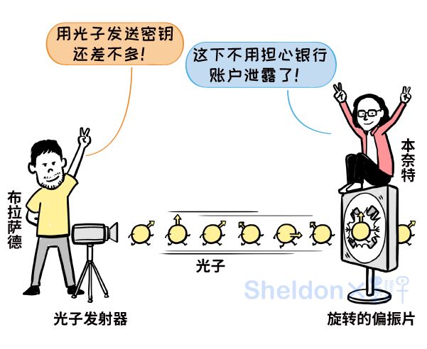 光子就是用来传播信息的,怎么能储存在口袋里呢?于是,布拉萨德和本奈特灵机一动想到,既然光子不适合储藏,只适合传播,那我们干嘛不发挥它的特长,让它来传递某种“不可伪造”、“不可复制”的重要信息呢?