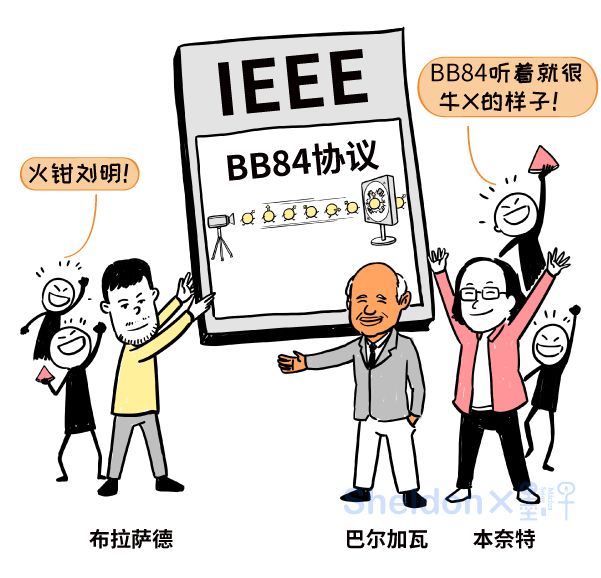 俗话说得好,在家靠父母,出门靠朋友。布拉萨德也有一个好基友,叫作巴尔加瓦( Vijay Bhargava )。巴尔加瓦正好在负责下一年的IEEE会议。于是,在巴尔加瓦的邀请下,布拉萨德和本奈特将他们的新理论写成了一篇文章,发表在了 1984 年的一次IEEE的会议上。正是因为这篇论文,他们的理论终于获得了更广泛的关注。并且,该理论最终以他们二人的姓名首字母命名,叫作 BB84 协议( BB84 protocol )。
