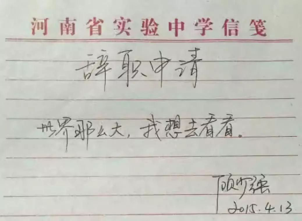 四年前,顾少强在学校标配的信纸上写下十个字,“世界那么大,我想去看看”,递给了年级主任,转身离开她工作了11年的河南省实验中学。