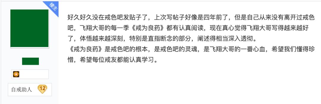 《戒为良药》已经陆续出到了第137季,并且还拥有了自己的app。而这本鸿篇巨著和另一本戒色宝典《戒者录》都出自同一个作者,也就是“戒色吧”的吧主“飞翔哥”(贴吧id:飞翔19820816)。