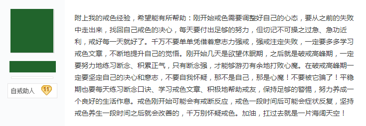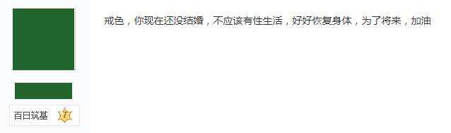 还有相当一部分戒色的吧友们,并不追求世俗的成功,而是希望获得更形而上的“功德”。他们将戒色看成是一种积累善功的修行,只要长期坚持,那么积累的福报不仅可以供养自己还可以福泽家人。