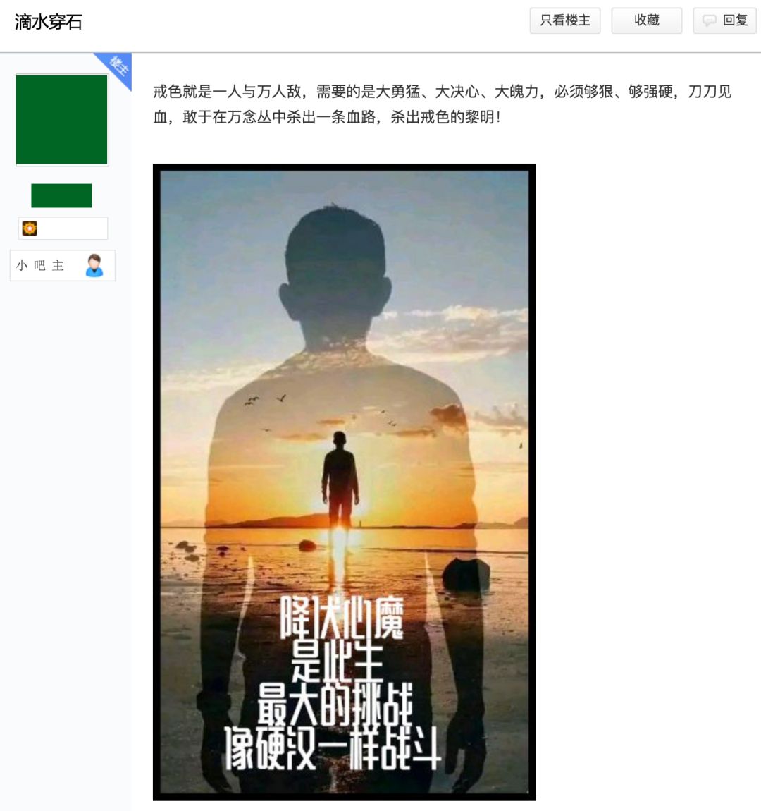 为了防止自己破功,他们会每天进行忏悔,时刻提醒自己不能被色欲诱惑,甚至研究出不少对抗“邪念”的经典疗法,在吧友间广为流传。