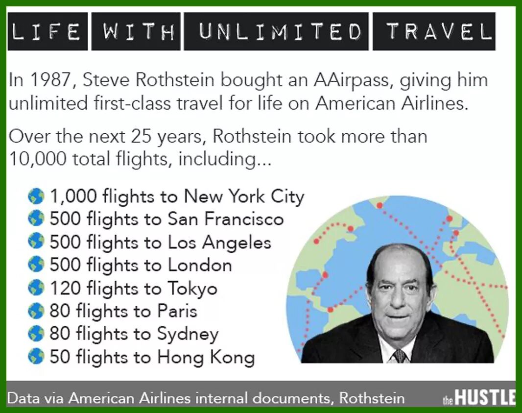 在25年的时间里,因为不停地订票,罗斯坦让美航巨亏2100万美金,他和其他28个终身免费会员差点把这个航空巨无霸坐倒闭了。