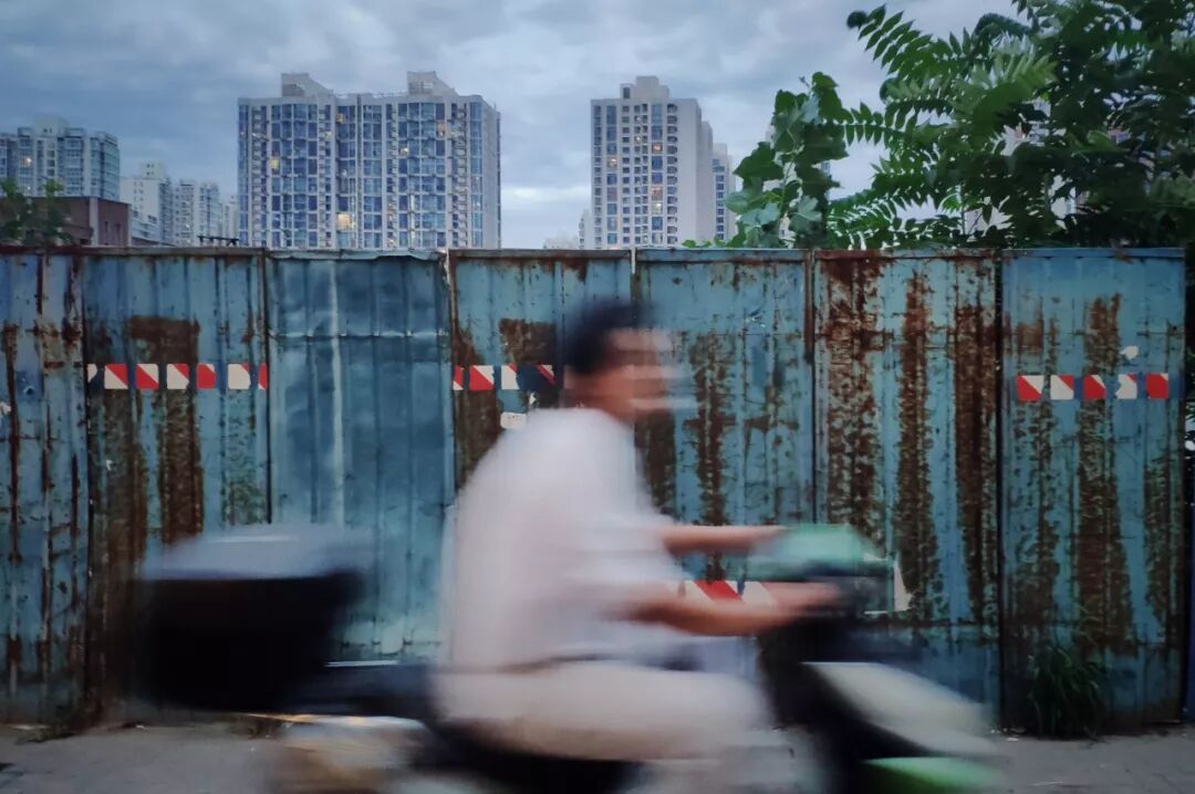 图 | 修路围挡旁,骑摩托经过的路人