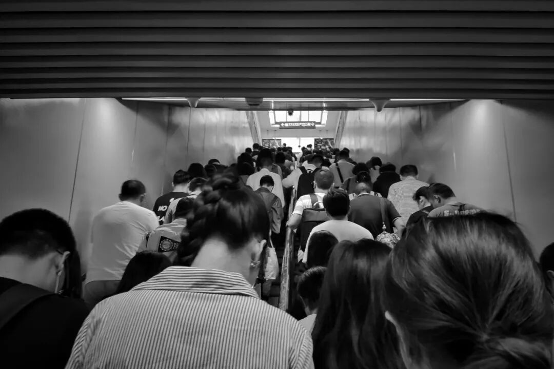 图 | 青年路地铁扶梯上,乘客排起长队