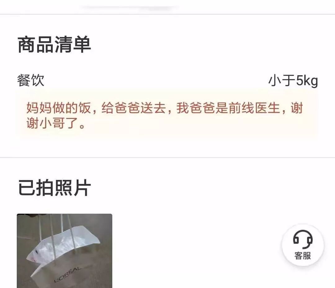 1月26号,快收工时,我接到一个订单,备注上写着, “妈妈做的饭,给爸爸送去,我爸爸是前线医生,谢谢小哥了”。