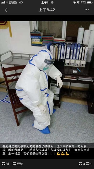 我们县此次抗击新型肺炎的主要阵地在县人民医院,而同学所在的中医院,昨天才被列入定点医院,医院三层楼的隔离病房已经住满,准备今天开第四层。目前,他们严重缺少相应的医疗护具,医护人员不分日夜地奋战多天,只睡了5、6个小时。他们无法下班,因为没有新的护具,即使其他人想接班的也没办法,在岗的医护人员已经穿了很多天尿不湿。