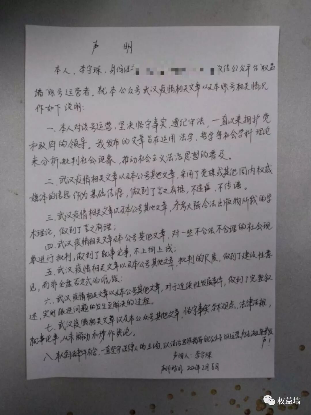 A景观在笔录里核实参与权益墙的师弟师妹个人信息(是核实,他已掌握),被我立刻回绝。我最后签名捺印的笔录版本里,所有表述均为权益墙作为李宇琛的自媒体,文章均为我一人负责撰写、编辑、审定、发布。