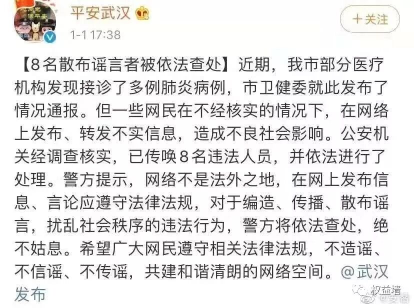 我在排出锁对着我的笔录核对,签字按完手印之后,一位井茶小哥开车送我回家,我打开手机,看到大家在说,李文亮医生去世了。我苦笑着,看着窗外的夜空,自我下午进来时,已经8小时过去。而我被带到排出锁的直接原因,是我运营的微信公众平台“权益墙”(即本号)为李文亮医生写的传在内的近期关于武汉疫情的所有文章。(史记 · 武汉疫情八造谣者传序)