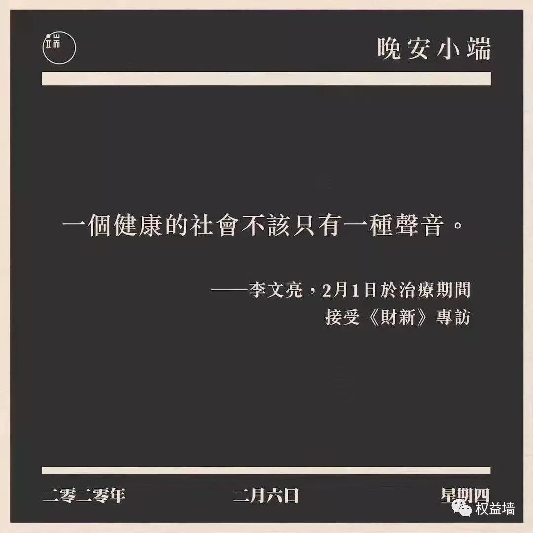 被训诫的李文亮医生离世,他说,健康社会不应只有一种声音,他在群里提醒了周边亲友。我想,我对他最好的悼念,是我继续做公民,继续做权益墙。