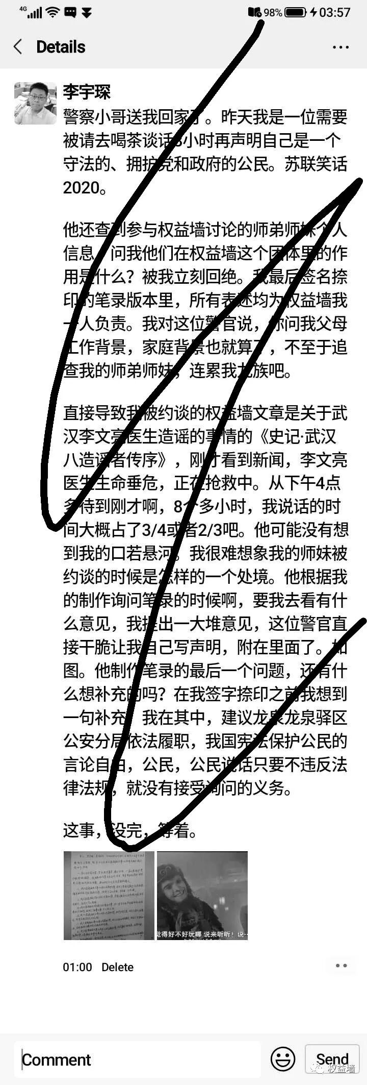 到排出锁后,他们要我等人来,我便在大厅坐着,环境很像我过去常被喊去的西政保卫处,淡黄色大理石地面,洁白的四壁印有红色标语。我发了第二条朋友圈,并联系我值得托付的好朋友,麻烦他截图转发我的朋友圈,以防我手机被检查而强制删除。所幸,我在被约谈期间,没有被收取手机,我爸妈担心我的安危,我发微信告诉他们在录笔录,我爸回我:“这回话不是你回的吧”。于是我拨通视频来电,我给井茶递过去,他们也聊了一会儿。