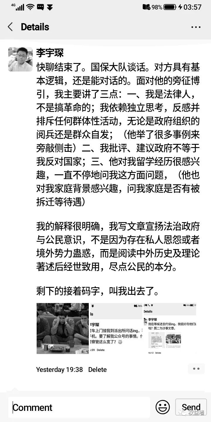 上车之前,俩井茶老的那位,询问起我的工作与学历,我回答律师实习,学历是西政本科,英国还有一本科一研究生学历,他说,高材生呀,高材生怎么网络发言还不谨慎?我问他,您说的是我哪条发言?他说他没看过,只是上面告诉他而已。我没有搭话,用手机发出第一条朋友圈,告诉大家,我被井茶带走。作为普通公民,公开是我唯一留存证据自我保护的方式。刚发完,旁边的年轻井茶对我说,手机收起来,现在别用。我说限制我的通讯自由,这是在拘传我吗?他说没有拘传你,只是请你配合工作,我说你工作得配合法律啊,老井茶来说我作为所长亲自来接你,你还要我怎么配合?
