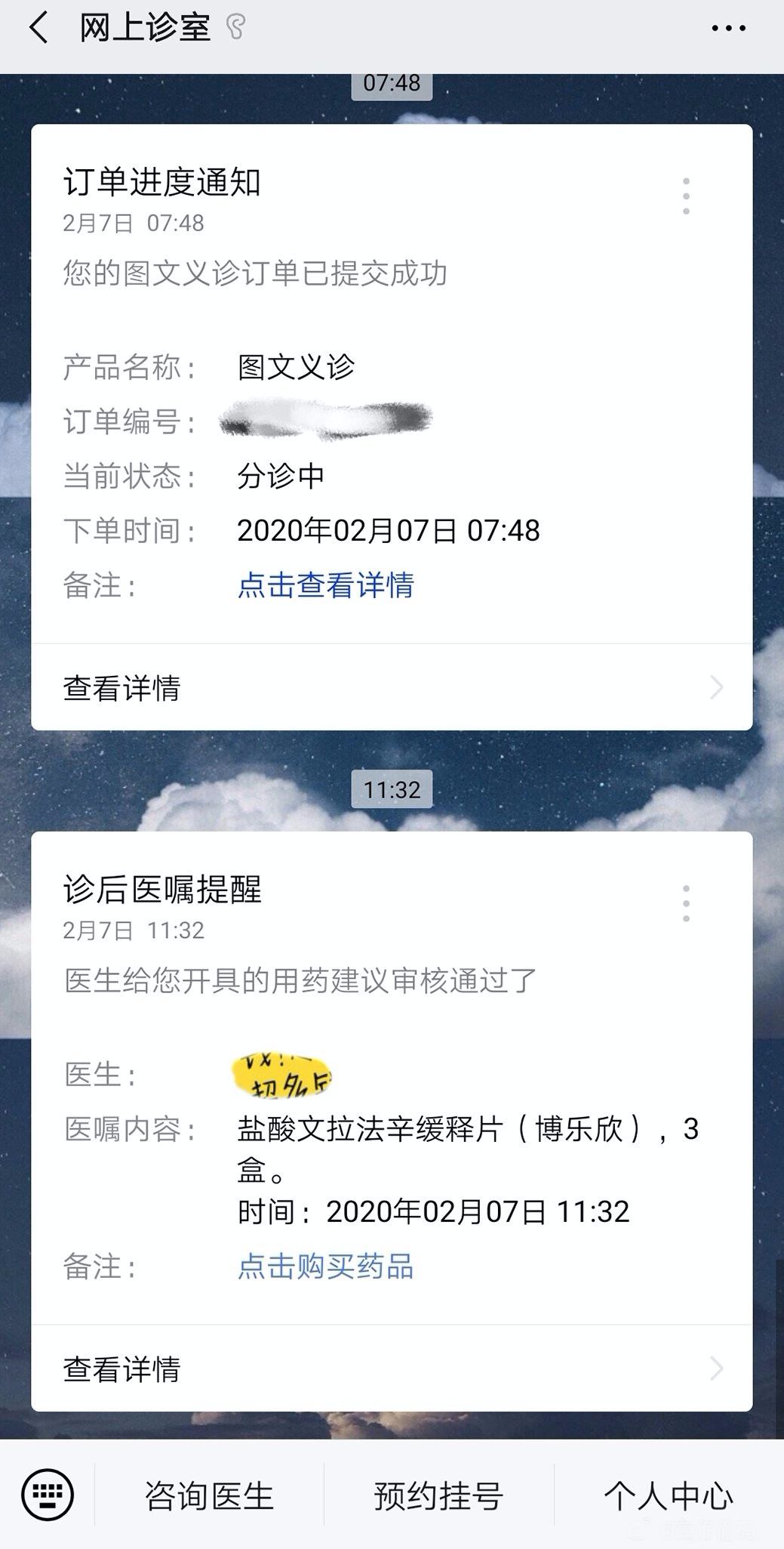 不惜一切代价也要买到药。一秒也不敢耽误。轰仔先是查询本地的精神卫生中心公众号,却发现精神科门诊在未来几周内都没有排班。这时,夹在病历和一沓处方单中间的卡片掉在地上,轰仔捡起来发现是复诊医师的名片。扫描上面的二维码后,她进入到一家网上诊室的公众号。