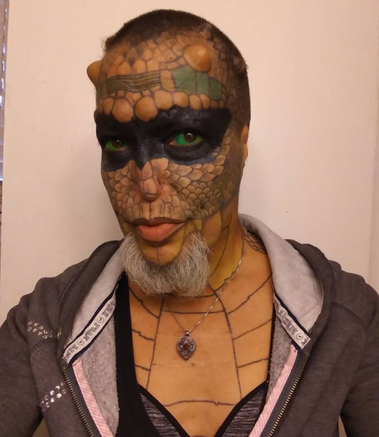 另一个更著名的跨物种者——“龙女”Eva Tiamat Medusa则走得更远。最早她是一个妻儿圆满的中年男人,后来她通过手术变成了女人。再后来,她又做了一系列手术,切除了耳朵和部分鼻子,拔掉了舌头前面的牙齿,好让切成两半的舌头能自如出入。
