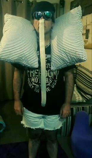 讲述这些的时候,他把胶管绑在鼻子上,耳边挂着两个枕头在地上爬行,并时不时地模仿大象的叫声。