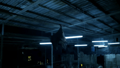 因人类砍伐森林,一群蝙蝠惊散逃出,其中一只飞到了猪圈上空。