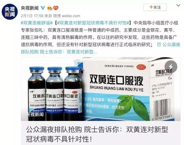 1月31日晚,有新闻说,双黄连可以抑制新型冠状病毒。于是当晚不少人去排队买双黄连,甚至有人因此被推挤摔倒。