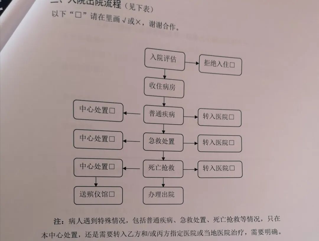 入住签合同时,三道生命选择题摆在了家人面前。普通疾病、急救处置、死亡抢救,由托养中心处置,还是转入医院?相久大总结了家属的反应:三项都选中心处置的,大都是子女或兄弟;夫妻或父母,在“急救处置”这一步时常陷入沉默。一旦犹豫,相久大告诉他们:“先别填了,到时候我通知你们,再决定去不去医院吧。”
