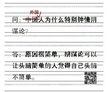 众多迷信阴 谋 论的普通大众,不一定有这位大娘这样的幸运。但是,阴谋论简单的思维方式,也的确给他们答疑解惑,给了诸多心理上的安慰。尽管这样的安慰,副作用很大。