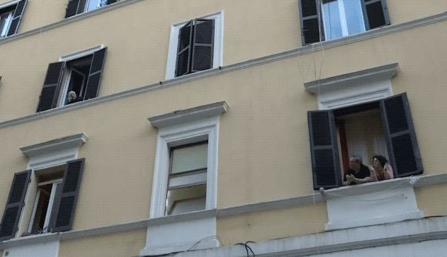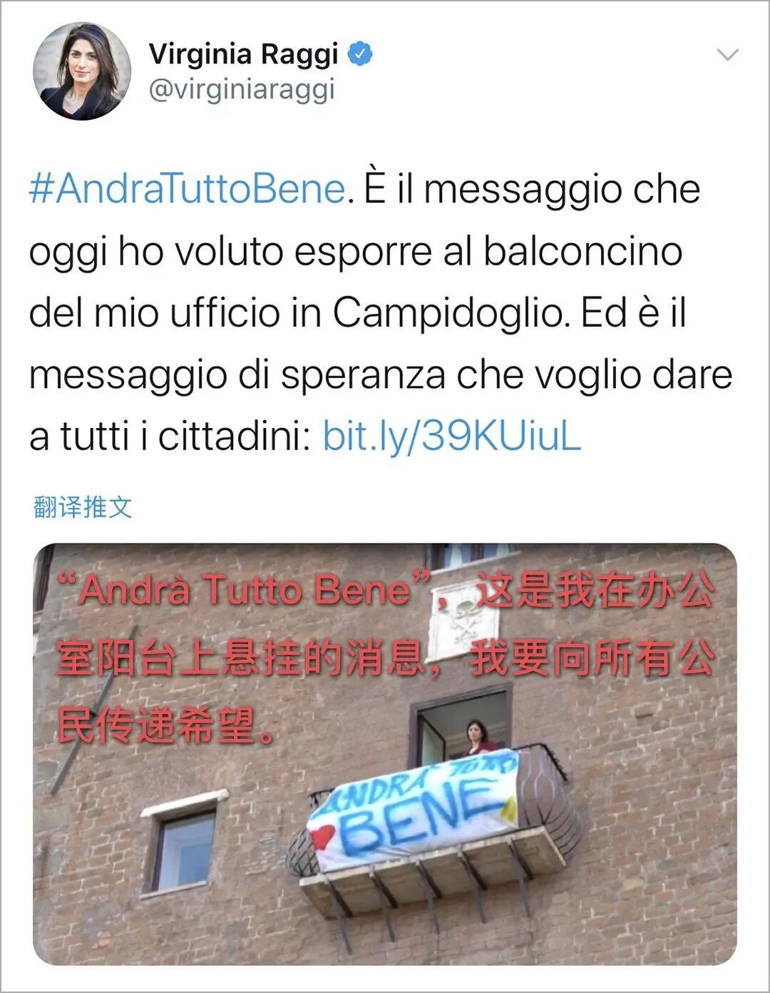 在意大利封 城 的第四天,罗马市长Virginia Raggi站在办公室的阳台上,呼吁罗马市民每晚6点钟时打开窗户,到阳台上唱一首歌,用乐观来传递希望。