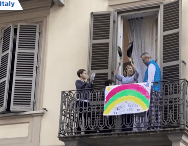她的阳台上悬挂着一张手工制作的条幅,写着“Andrà Tutto Bene”