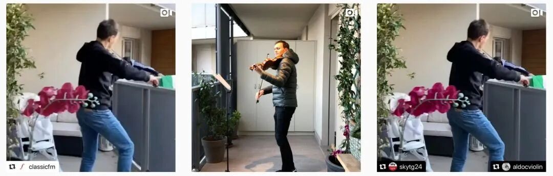 意大利Rai国家交响乐团首席小提琴手Aldo Cicchini则自主发动“阳台音乐项目”,他先是演奏了作曲家德彪西的《月光曲》,在万籁俱寂、悠扬婉转的曲调中悼念因肺炎去世的一位朋友。