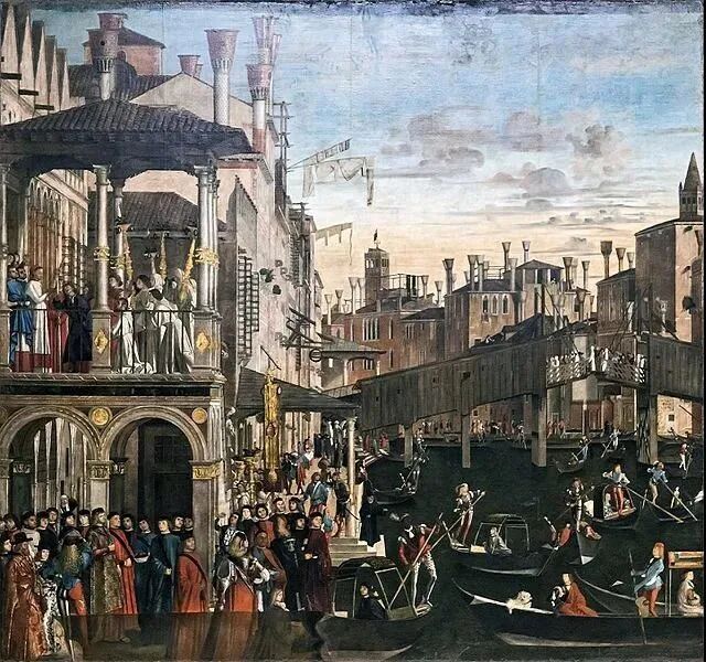 威尼斯画派艺术家 Vittore Carpaccio,《Miracolo della Santa Croce a Rialto》,展现了 Altana(柱承式阳台),小型的木制露台上演了最主要的戏剧冲突。