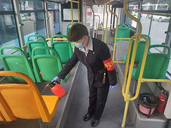 消毒人员在给公交车消毒