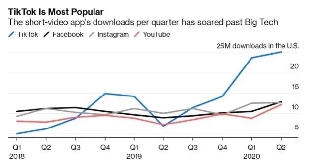本来字节跳动是短视频社交领域的王者,抖音和TikTok是足以挑战传统社交巨头微信、脸书的互联网新锐力量。这是2020年第一、第二季度TikTok在美国的下载量,超Facebook、Instagram、YouTube。