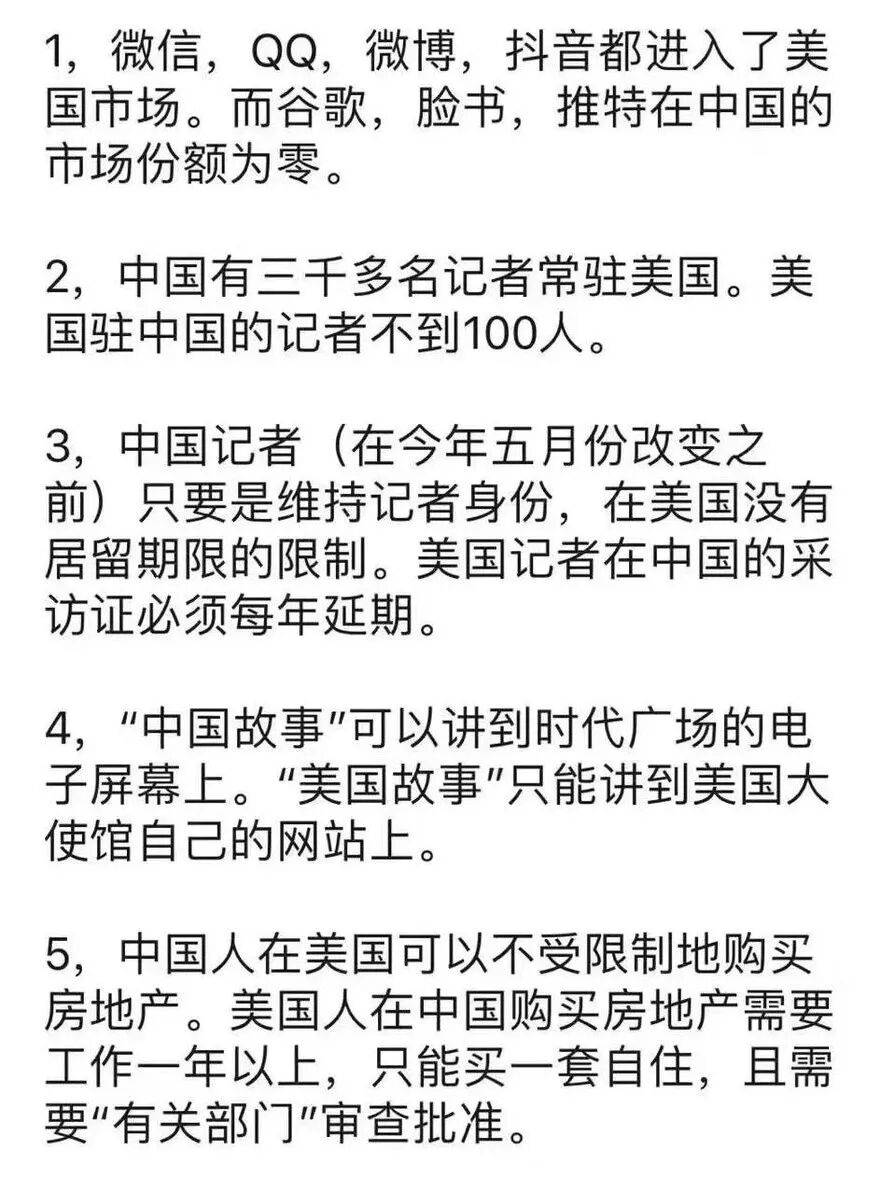 从TikTok可以引申出一点,就是美国对华政策的新基准,不是“互惠”,是“对等”。这意味着,美国下手不会再客气,只会抄作业,你怎么样,我就怎么样。