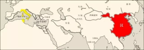 ▲罗马文明(黄色区域)与汉文明(红色区域)