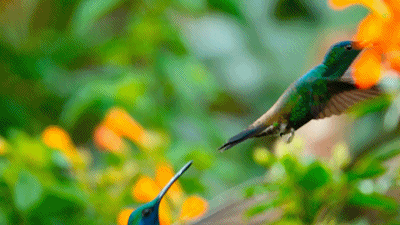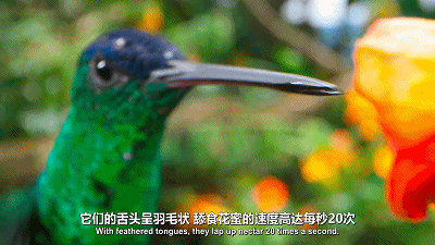 比如蜂鸟,每隔几分钟就必须进食,它们的舌头呈羽毛状,舔食花蜜的速度高达每秒20次,它们不得不快速行动,因为还有同伴前来竞争...