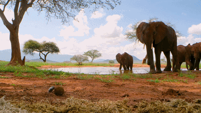 象群们正在大快朵颐,而在它们的脚下,另外一群生物也在觅食。
