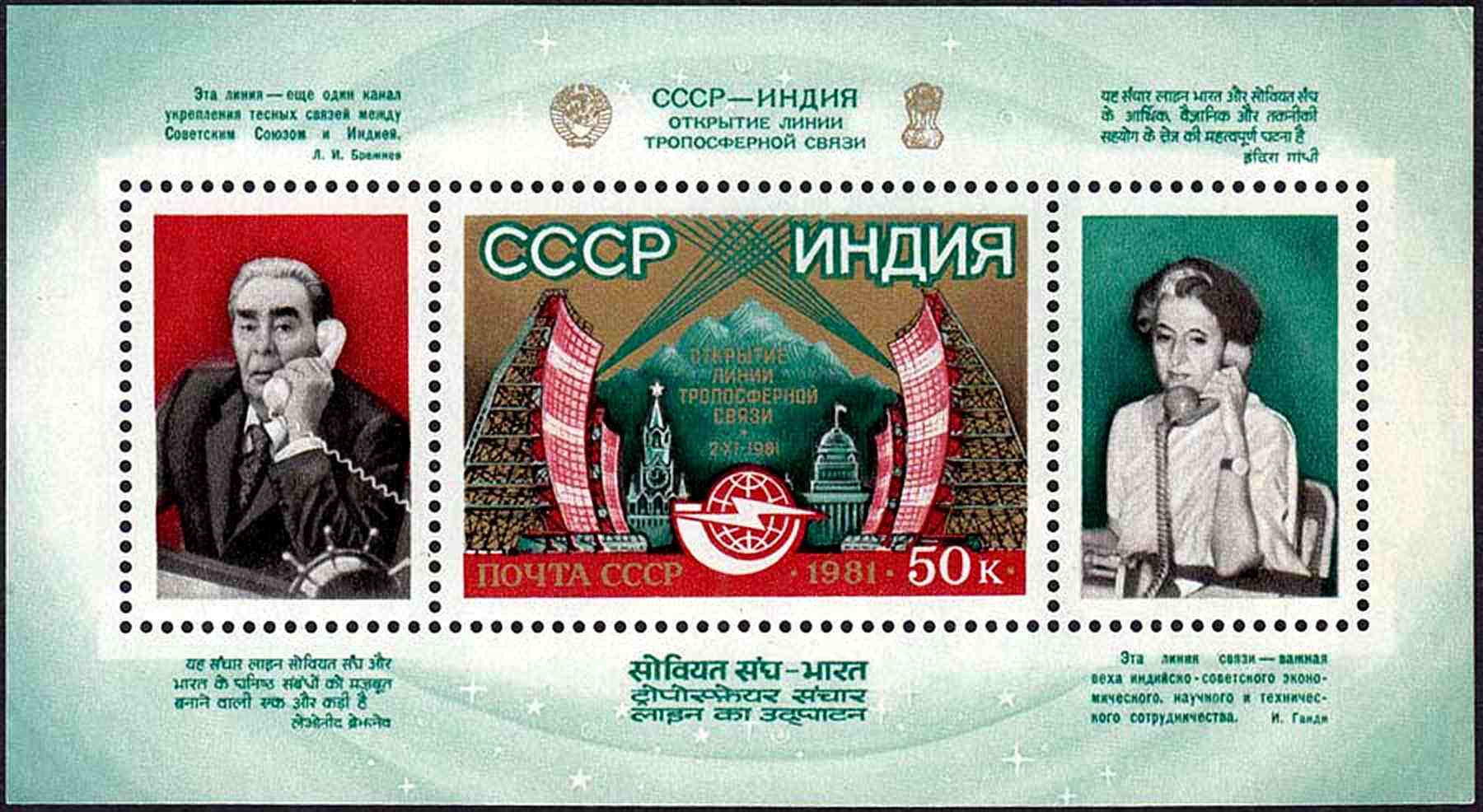 苏联邮票,图为勃列日涅夫和英迪拉·甘地通话