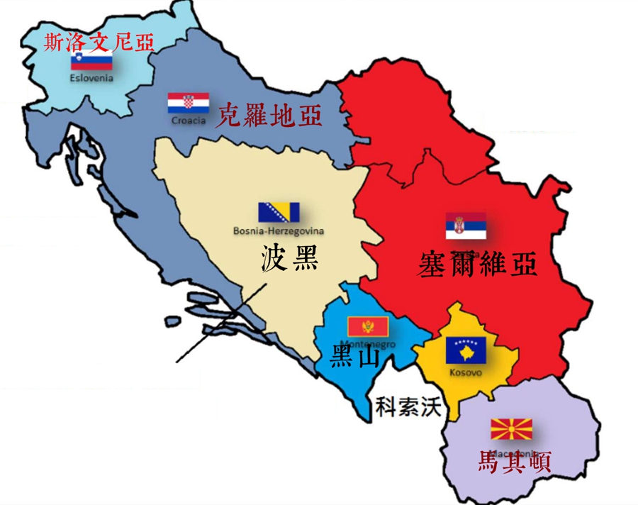 六个共和国(斯洛文尼亚、克罗地亚、塞尔维亚、波斯尼亚和黑塞哥维那、黑山、马其顿),