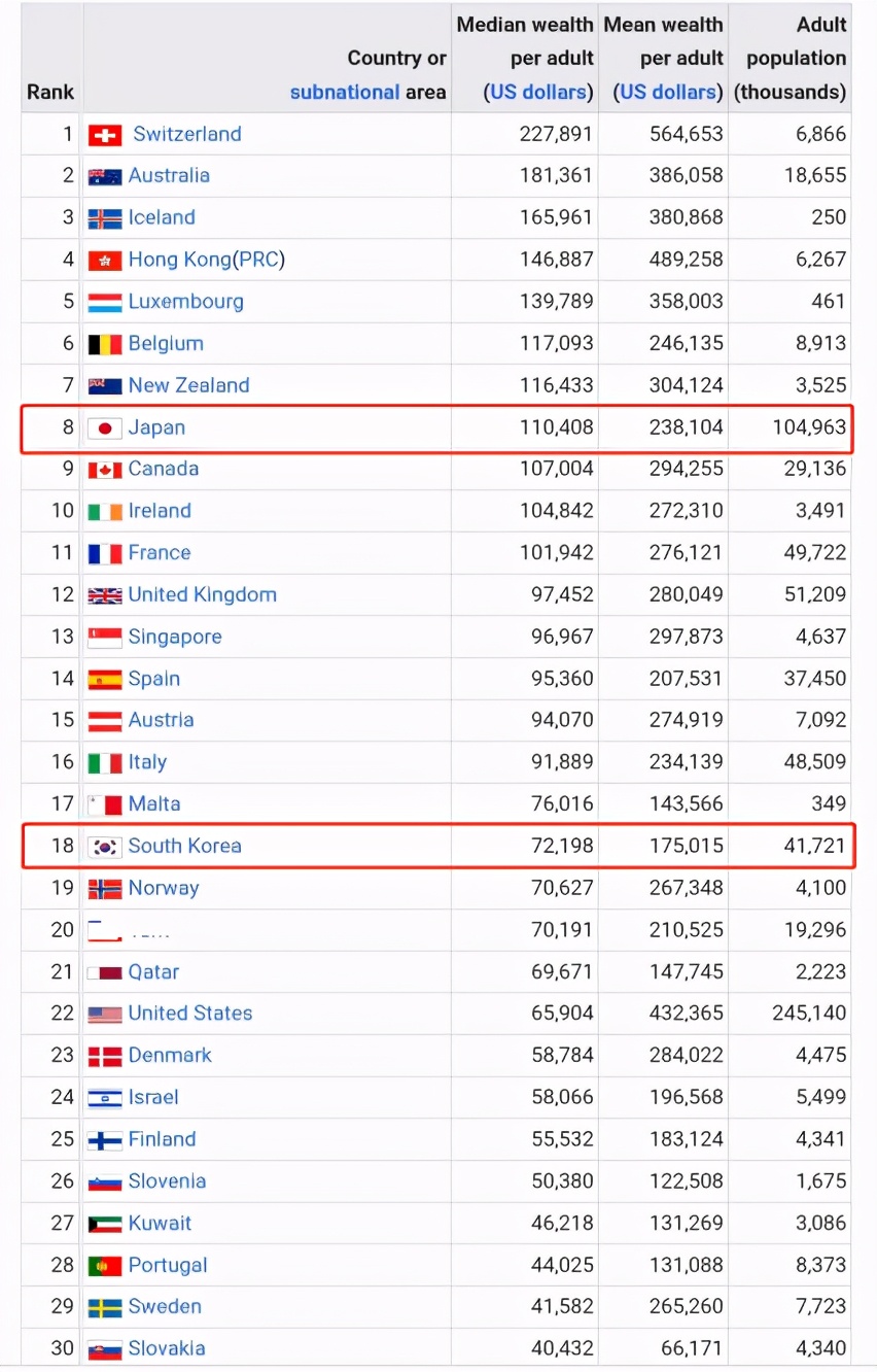 韩国也不差,成年人中位数净财富也超过了7万美元,与意大利、挪威等国相当。