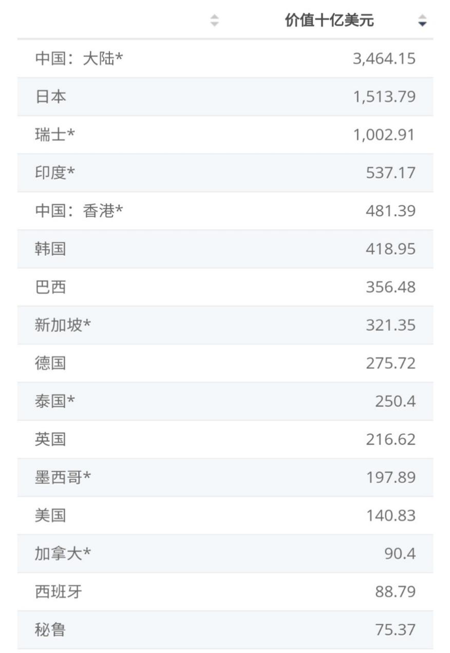 主要国家及地区的外汇储备,日、韩远高于英法德