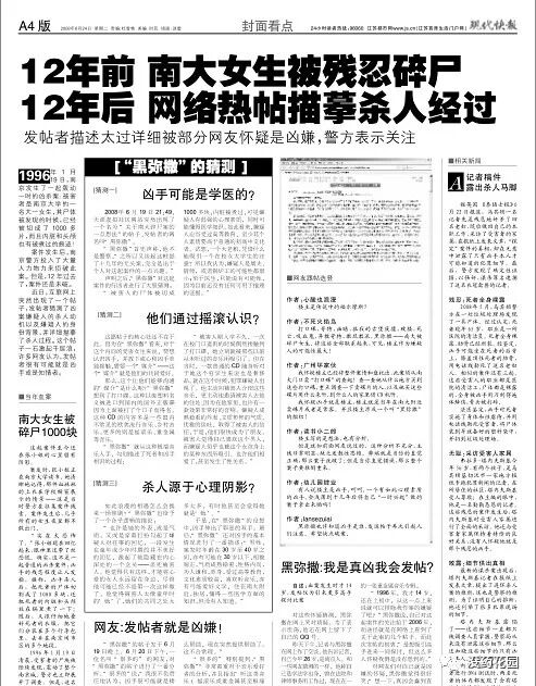网上一有人提点假设,就有人跟着嚷嚷那个ID是凶手。更可笑的是,一个叫“潜水啊潜水多年”的女网友,完全以八卦的口气,却也被认为是凶手。还有一个叫WCAT666的天涯网友,由于绘声绘色描绘碎尸的场景,甚至被海外小肠移植阴谋论收录,说TA就是那个28岁受体、某总参谋长的儿子。