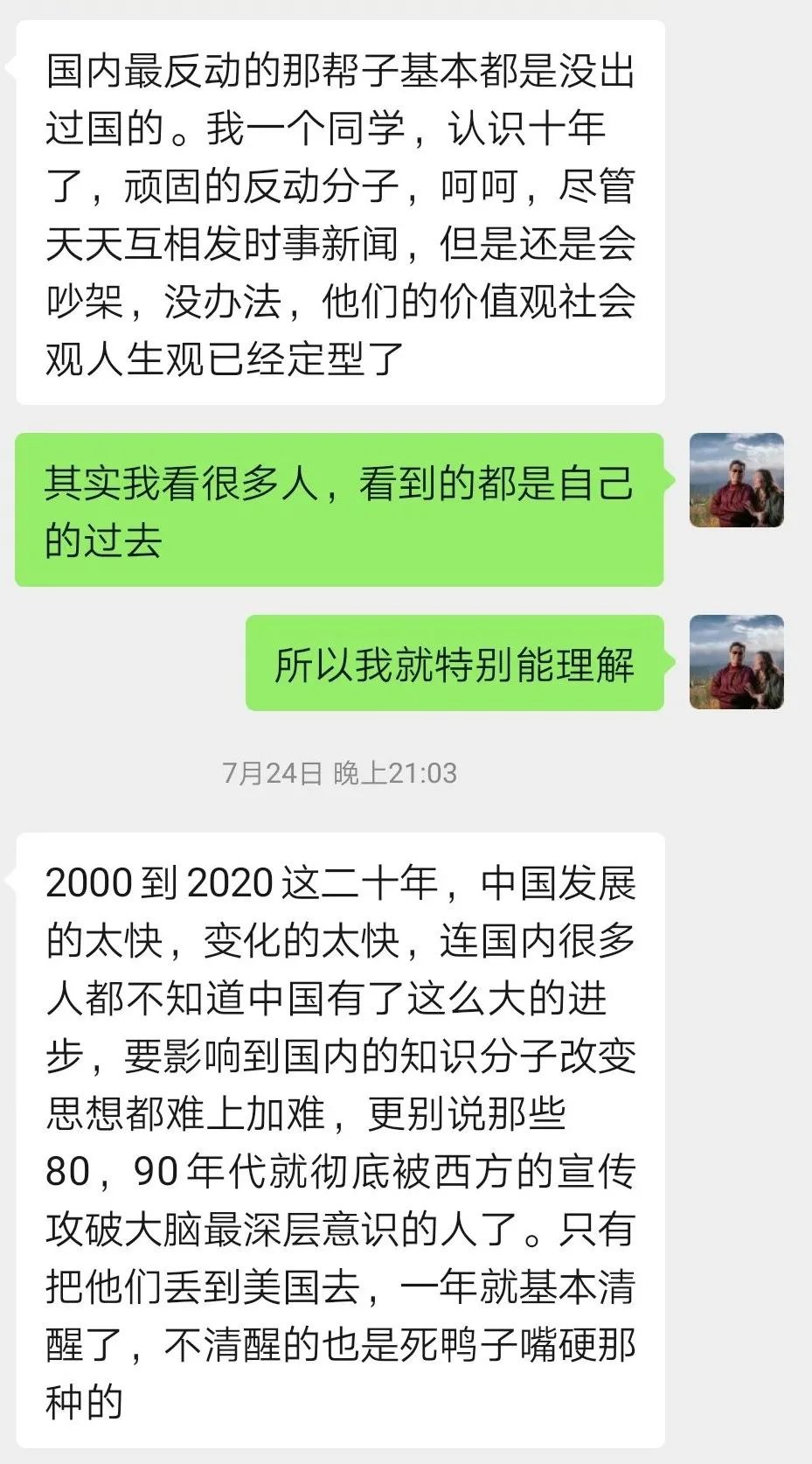 有些东西的是非对错本身就一言难尽,如果你一直待在中国,会永远看不清楚,只会一味的抱怨和谴责——不识庐山真面目,只缘身在此山中。 我十年前有一个关系很好的兄弟,我们俩三观特别合,都十分愤世嫉俗,后来他搬去了海南开始了新生活,而我也开始浪荡的生活,后来就不怎么联系了。多年之后,当我们再次对话,他听了我一些对世界的新观点之后,震惊之余怒不可遏地对我破口大骂,他觉得我背叛了我们当年共同的信仰。我却一点都不生气,因为现在的他就是当年的我,可我已不再是当年的我。虽然他无法理解我,我非常能够理解他——他从来没有机会走出国门去看一眼真实的世界。