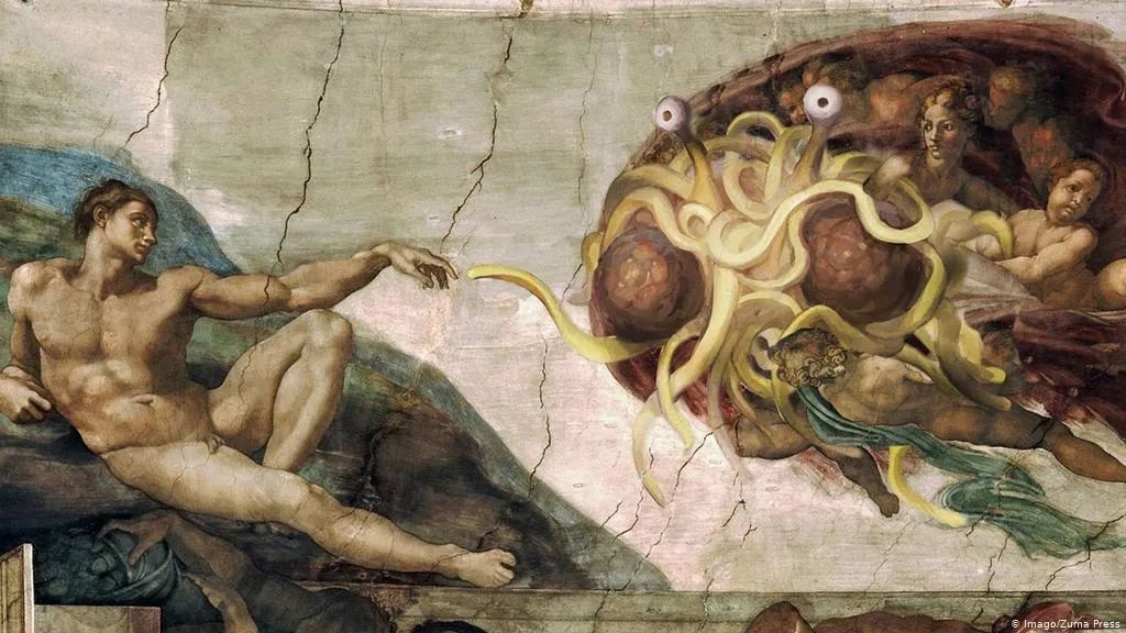 一个不可见,且不可感知的“飞行着的意大利面条神怪”(Flying Spaghetti Monster)在“一次严重的酗酒后”,创造了整个宇宙……