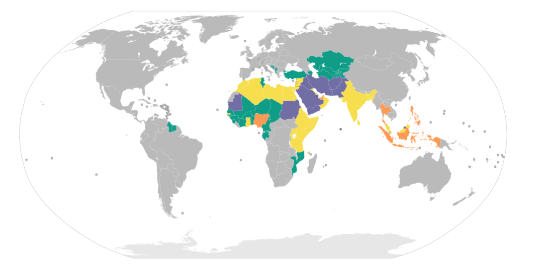 橙色:伊斯兰教法的适用范围在不同地区有差别