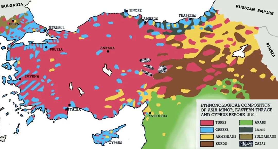 大家都知道第一次世界大战其实是工业革命之后欧洲列强重建殖民、经贸秩序的一场战争,当时衰败的奥斯曼帝国赌上了自己国运,跟德国、奥匈帝国结盟,结果战败后被瓜分。在瓜分奥斯曼帝国的《色佛尔条约》里,列强把土耳其东部大片亚美尼亚故土都划给了亚美尼亚,黎巴嫩和巴勒斯坦这些政权也是奥斯曼帝国的原有领土划出来的。