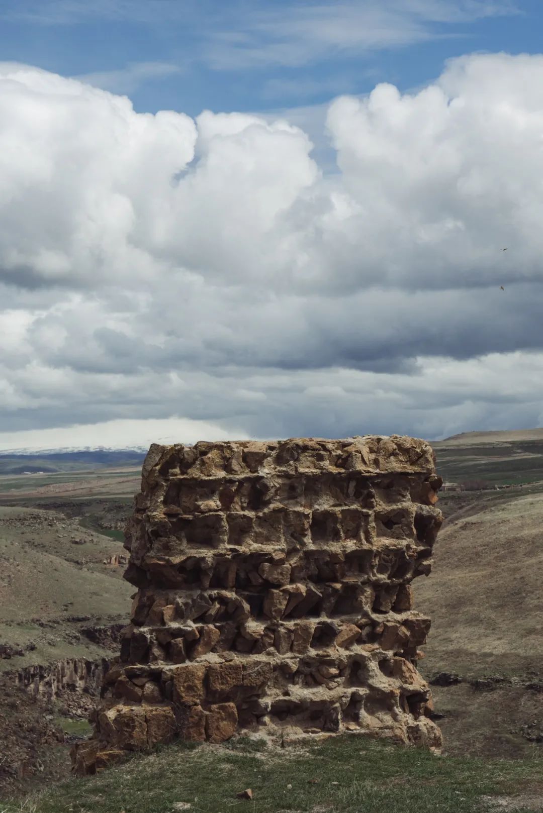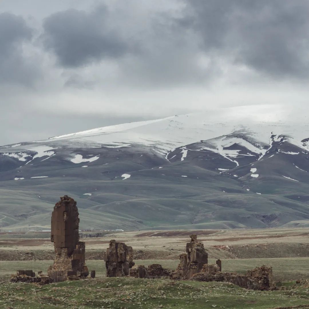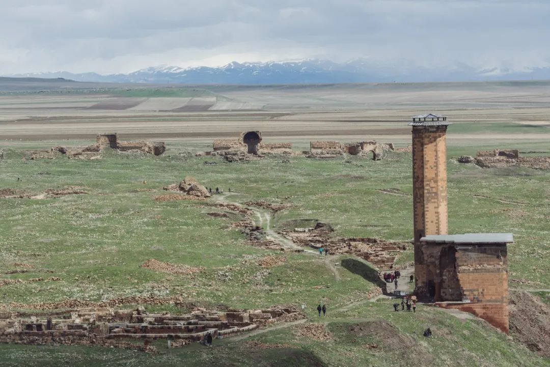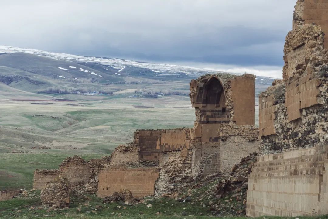 我来阿尼的时候时值四月,土耳其东部小高加索地区正是春雪时节,大地已染上片片新绿,山头依然覆盖皑皑白雪,路上的风景看起来有些像青海,荒凉而辽阔。由于海拔和纬度的关系,这边似乎只适合放牧,几乎没见到农田。因此也就更加难以想象,在这样一个偏远的地方如何会孕育出阿尼那样一座繁华的“国际大都会”
