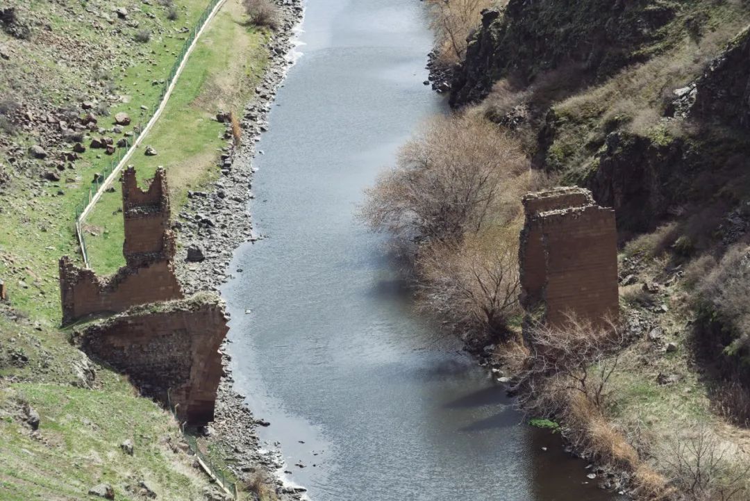 阿尼古城最为让人唏嘘不已的,是这里距离亚美尼亚的国境仅有咫尺之遥,真正意义上的“一衣带水”——甚至蹚着水就过去了。站在阿尼古城可以看见河谷对面的亚美尼亚的国旗,以及戒备程度非常高的边防布置。曾经在河谷中有一座石桥,连接着两岸贸易往来的商路;而如今,石桥只剩残留的桥墩,两边都竖起了铁丝网和警戒塔,桥断墙立,咫尺天涯。