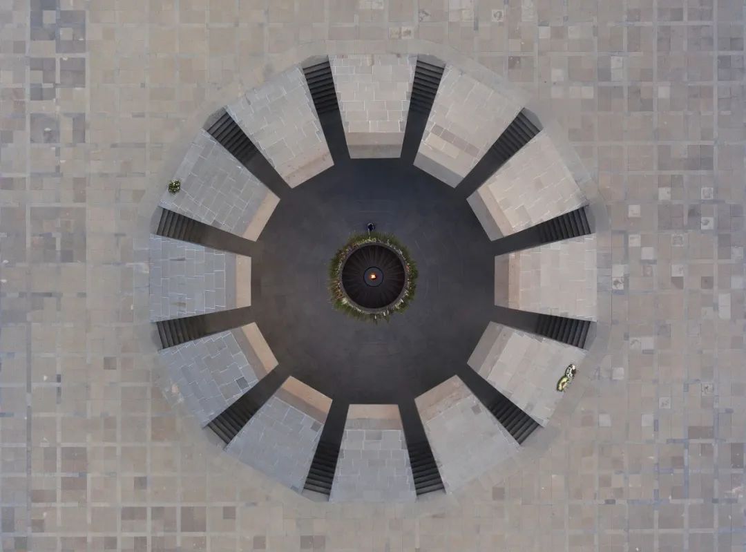 纪念馆本身采用了下沉式的建筑设计,广场其实是纪念馆的“屋顶”,入口处是往下走的,仿佛走入墓穴般的寓意。